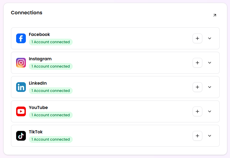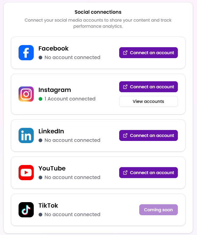 Med Connections kan du forbinde dine sociale medieprofiler direkte til platformen. Det gør det nemt at dele dit indhold og følge med i, hvordan det performer – uden at hoppe mellem forskellige apps.