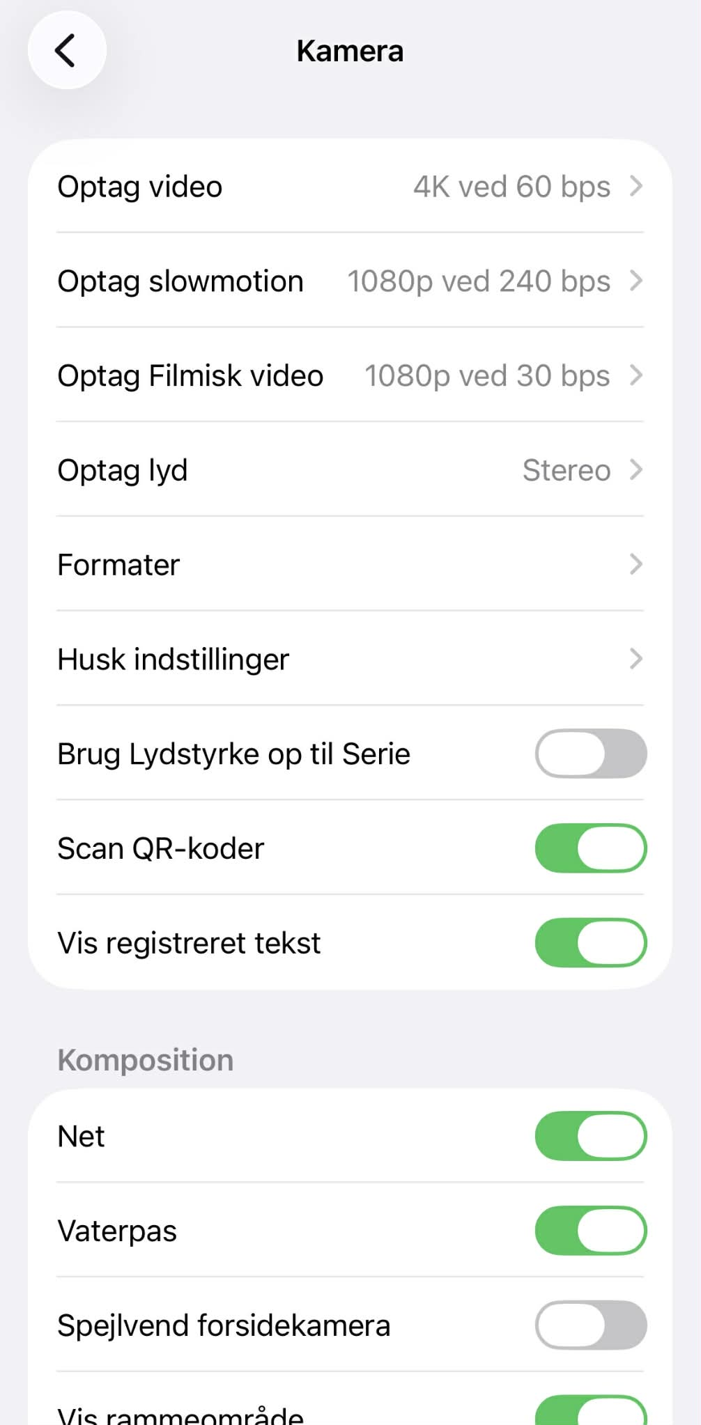 Indstillinger → Kamera → Optag video