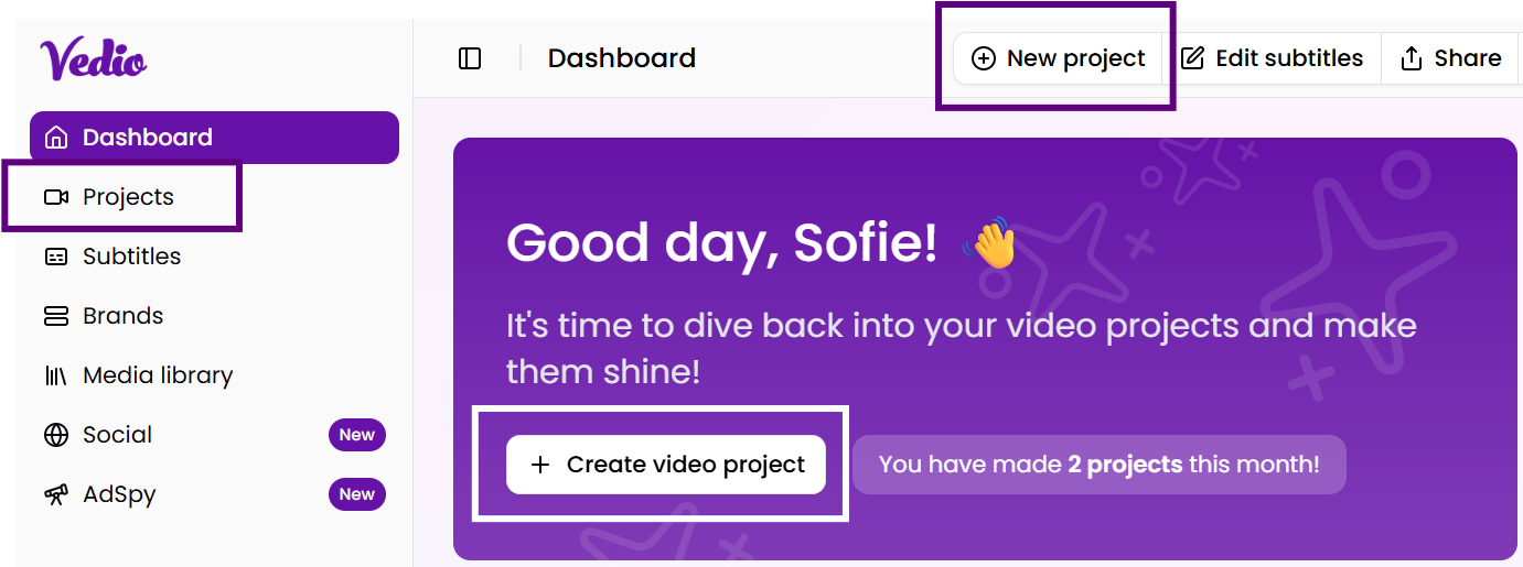 Det er hurtigt at oprette et projekt i platformen. Fra dit dashboard kan du starte et nyt projekt flere steder – klik blot et af de tre steder, hvor det vises på billedet nedenfor.