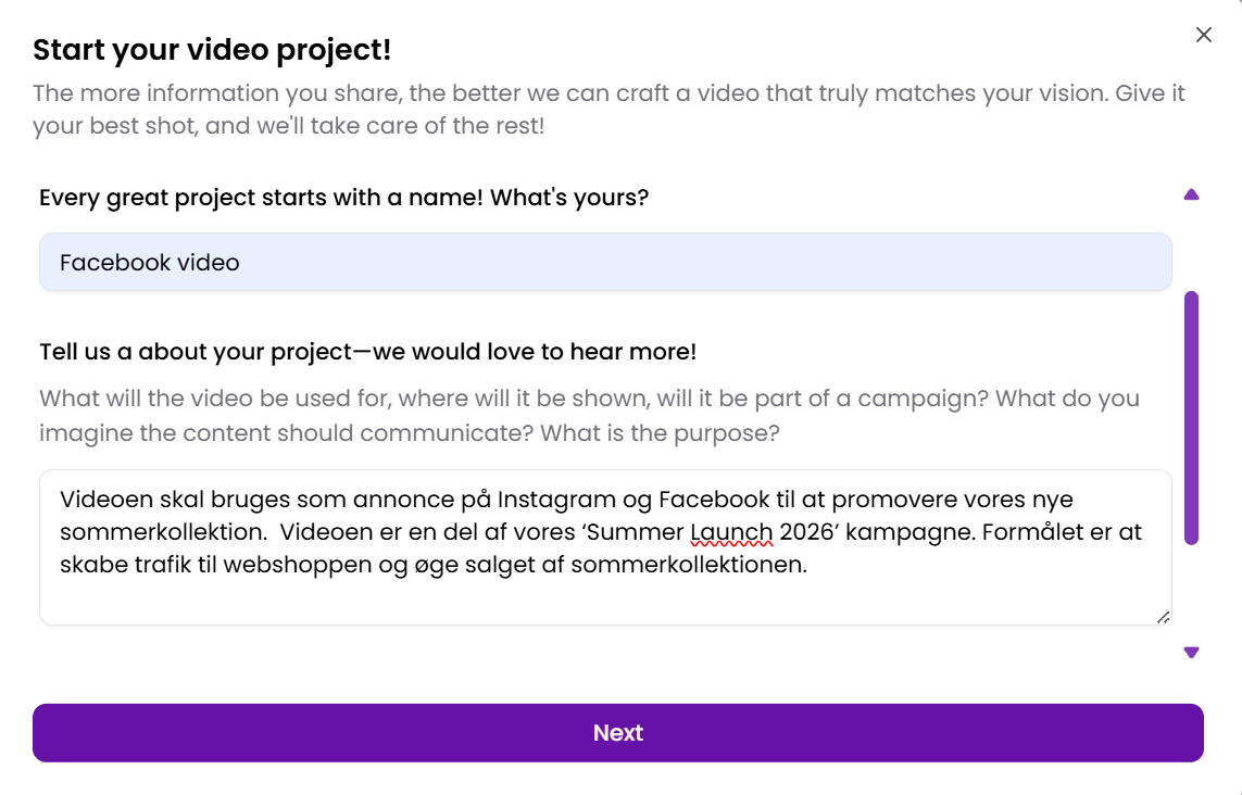 Start med at give projektet et navn og beskrive, hvad videoen skal bruges til. Jo tydeligere briefen er, desto lettere er det for din editor at forstå retningen.