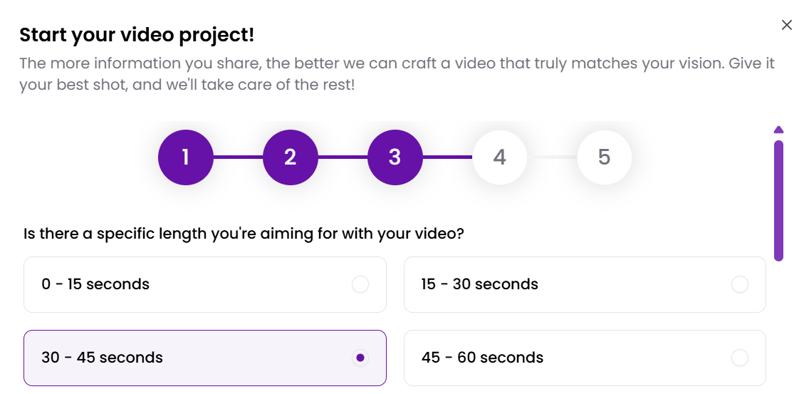 Når du starter et projekt, guider platformen dig gennem 5 enkle trin, hvor du giver din editor den information, der er nødvendig for at producere videoen.